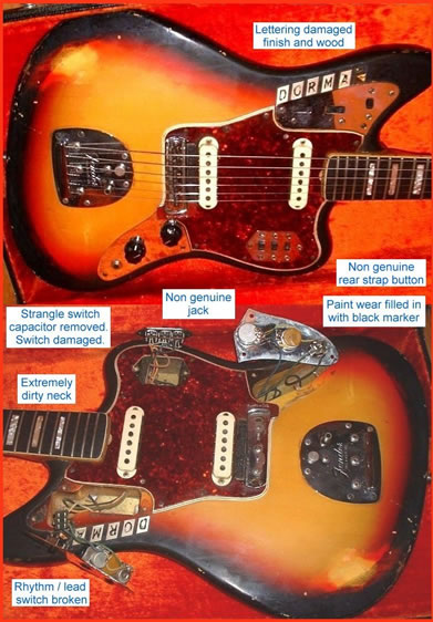 I was interested and a week or so later, Doug was able to pull apart the Jaguar and send me the neck/electronics/guard/bridge etc. In turn he sent the body to Lays in Ohio for a refin. As you can see by the photos the original sunburst was worst for wear with one of the previous owner(s) using a black marker pen to “colour in” the worn black of the burst.