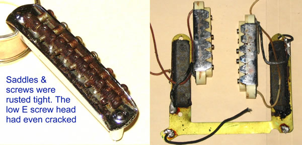 While the body was being refin’d I worked on the other issues. These were the bridge being rusted solid, gunge and grime everywhere, a nut that needed to be replaced, PUP switches not working, upper rhythm control circuit disengaged, a second generation F tuner which had replaced a stuffed first gen F tuner (the enlarged hole in the head stock needed to be dowelled and re-drilled).