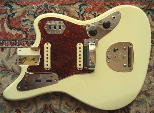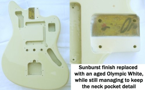 I chose for the refin a vintage Olympic white, but a version of the Oly White that I had seen on a ’66 Jazzmaster which had almost a primrose hue to it. Lays did a great job stripping back the body, managing to keep the neck pocket markings. They shot a nitro finish which included a tinted nitro finish at the end with some “dummy” guard/plates/trem in place to give a shadow effect (similar to that described in Doug’s “63 jaguar” expose).